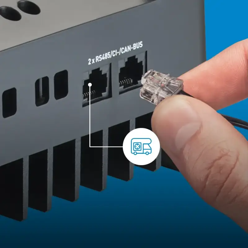 RS485/CI/CAN-bus voor parallel laden of aansluiting op boordmonitoren. Synchroniseert zonnepanelen met verschillende spanningen, zonder enige verlies.